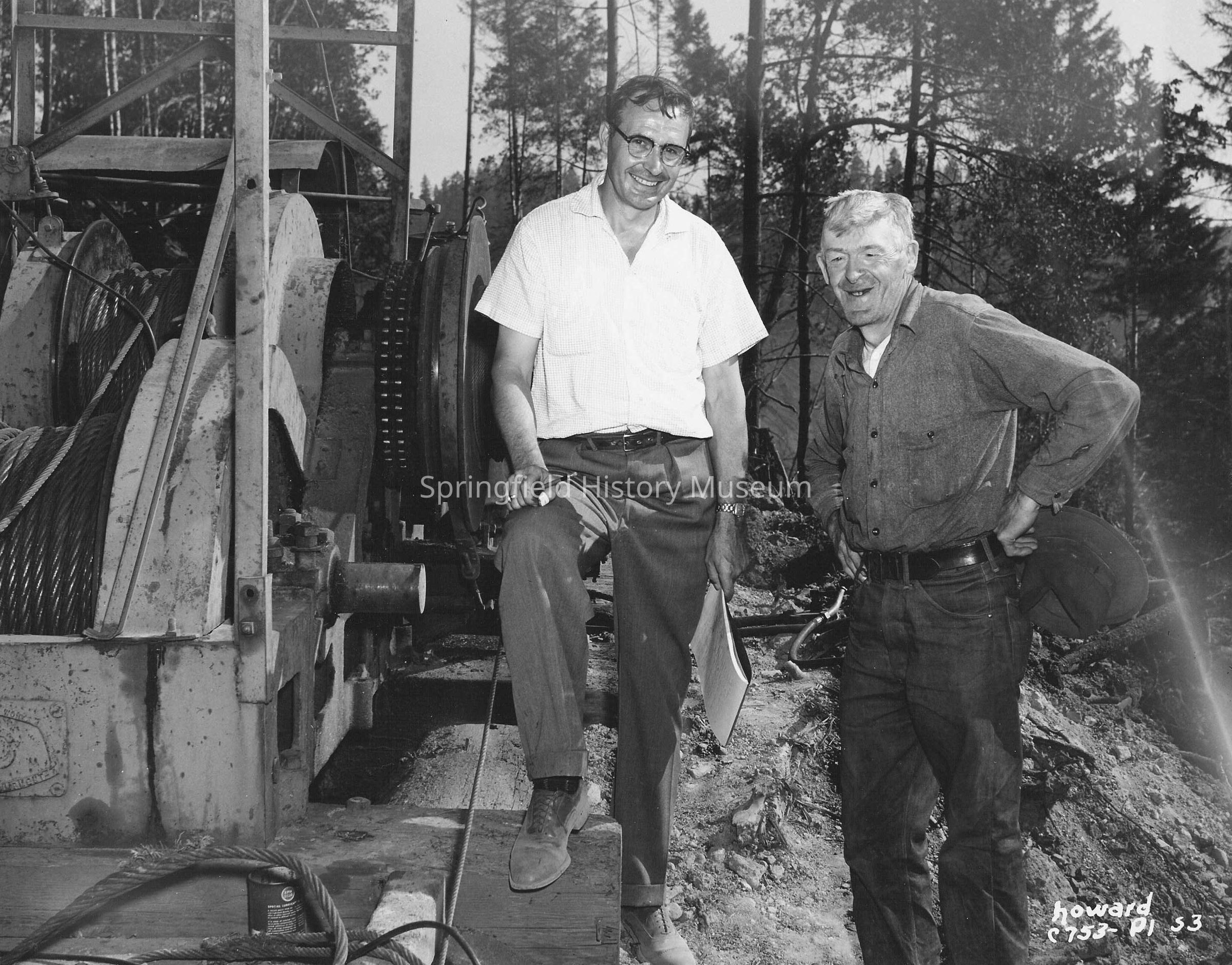 Photograph of two unidentified men standing beside donkey engine. Marked Howard C753-Pl53, undatedCollection