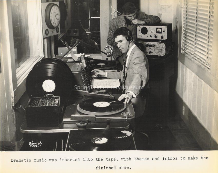 Photograph of two men at K.O.R.E. inserting music into the story. Promotion for the Springfield Chamber of Commerce; K.O.R.E. photos of putting together " The Story of the Log". Marked Howard C 406-1. undated