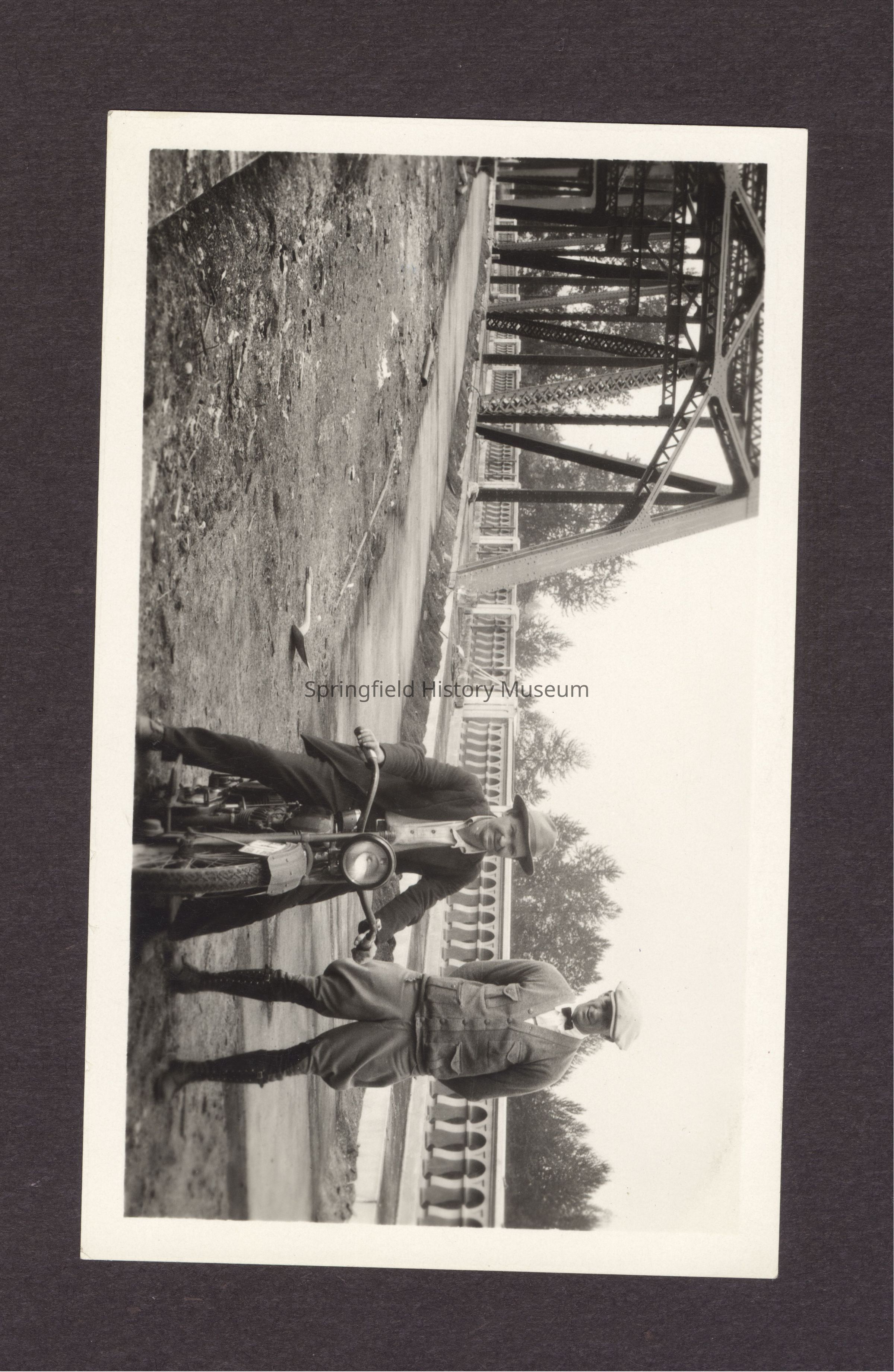 Photograph of two men one standing and one sitting on a motorcycle with bridge in background. Date unknown.Entry/Object ID