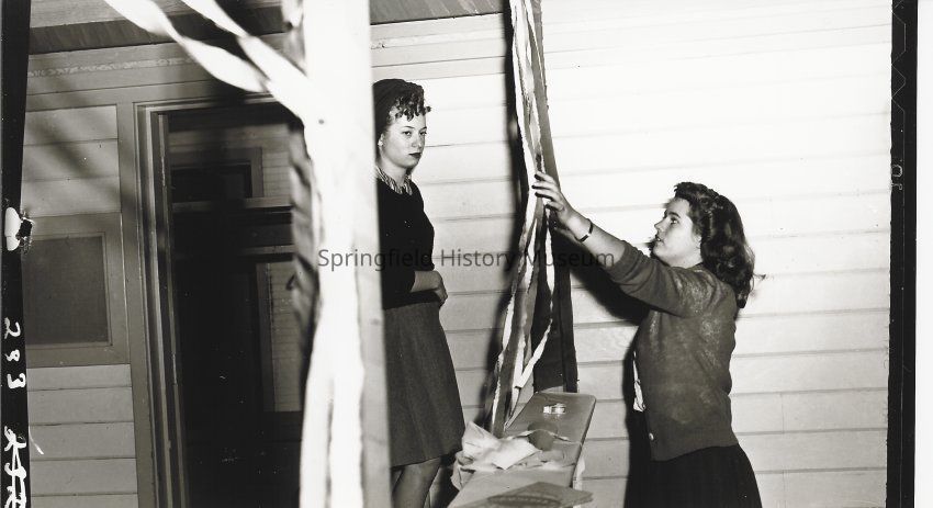 Photograph of two Springfield High students setting up for carnival activities; circa 1940s.Photograph Details
