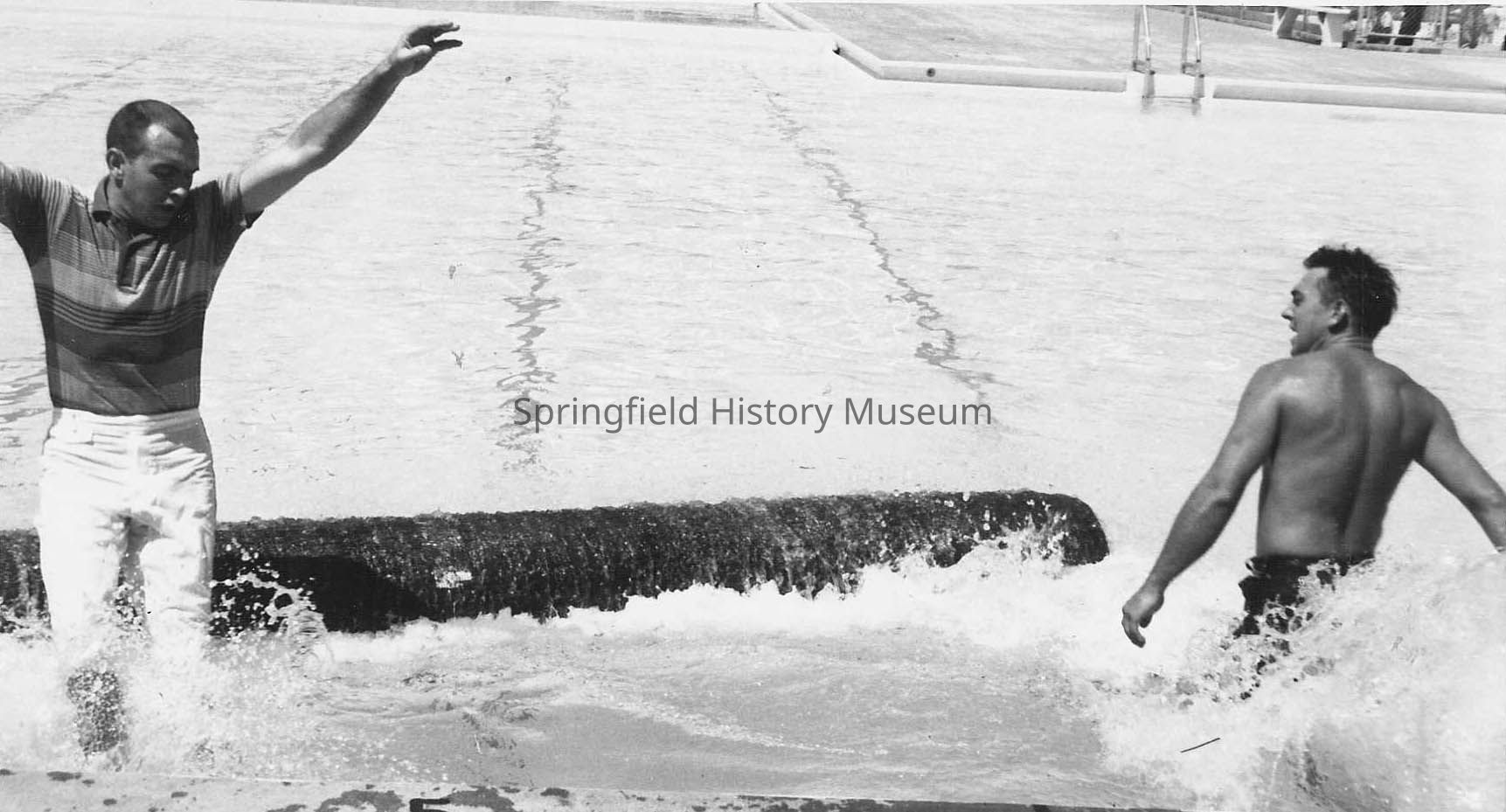 Photograph of two unknown men jumping off log in swimming pool. A log rolling contest possibly at Broiler Festival. UndatedCollection