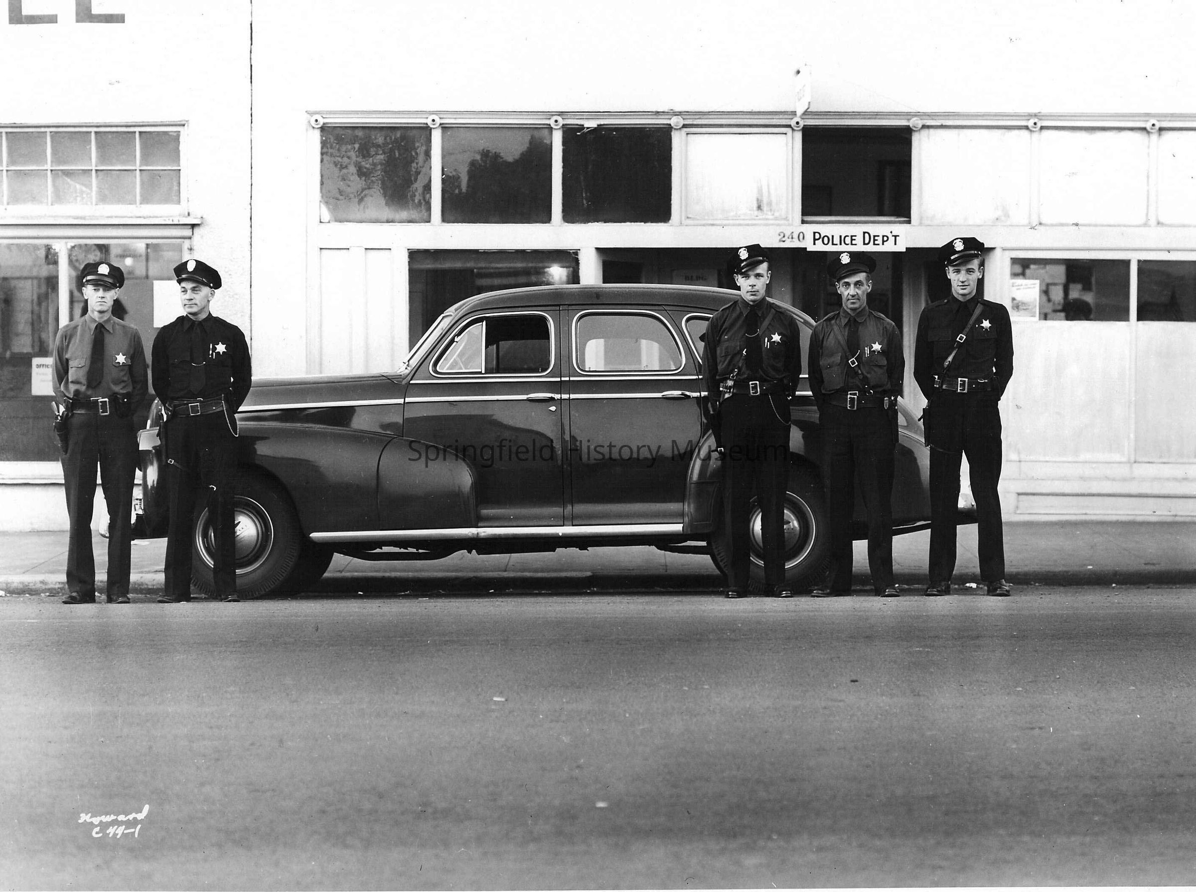 Photograph of uniformed officers posed in front of car at police department, Springfield, Oregon, date unknownEntry/Object ID