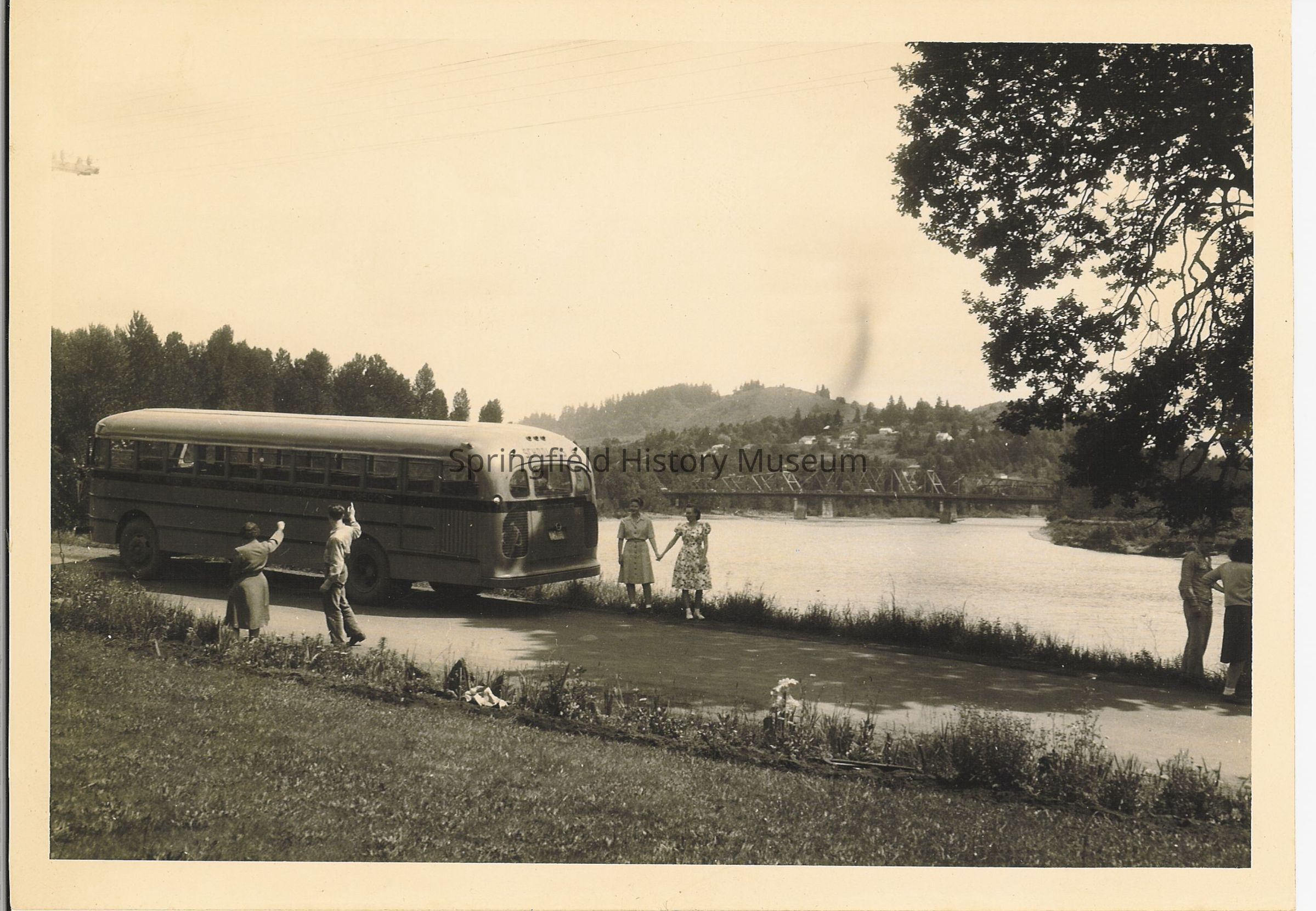 Photograph of Union High School Bus at the Willamette River, Springfield, circa 1940sEntry/Object ID