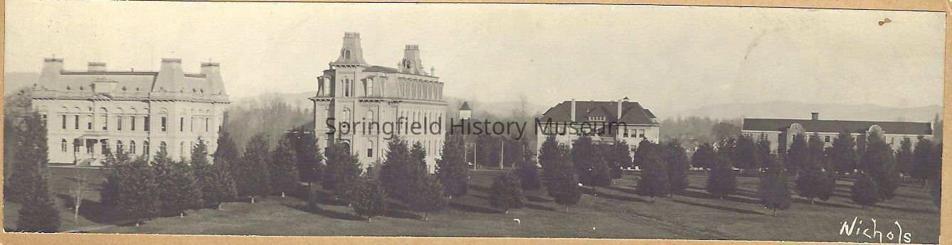 University of Oregon, panoramic view of four buildings: Deady, Villard, Friendly, former art building and kiosk.Collection