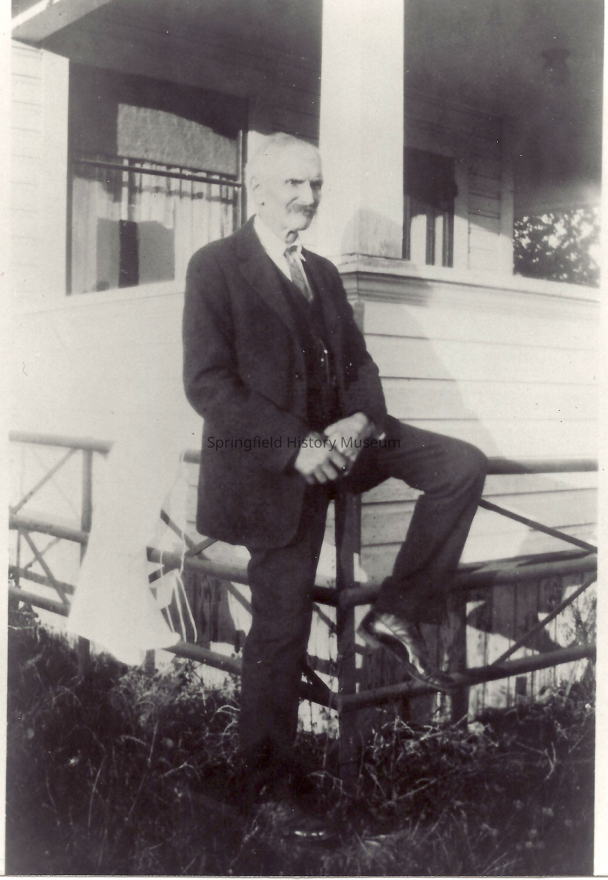 Photograph of unknown man outside a unknown house, location unknown, undated