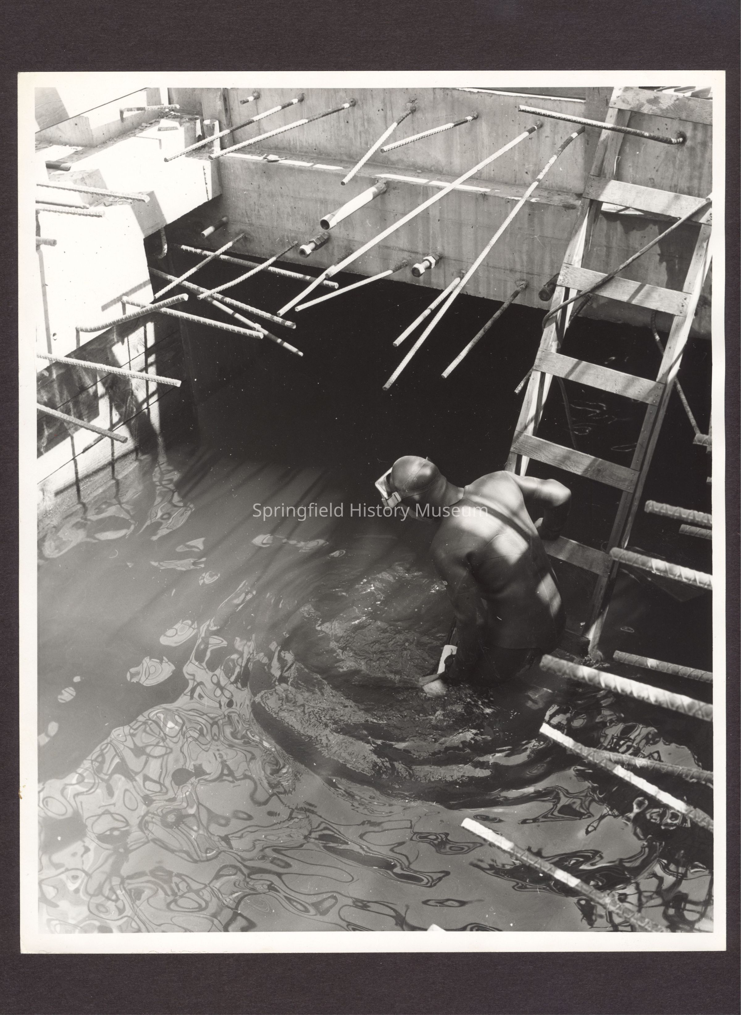 Photograph of unknown man in a wet suit looking into water at bridge construction worksite. Date unknown.Entry/Object ID