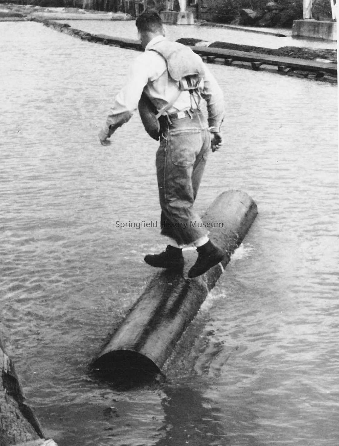 Photograph of unknown man standing on rolling log in water that is probably a river. Man is wearing a floatation vest. In the background can be seen a floating wood boom and two bridge supports. Undated