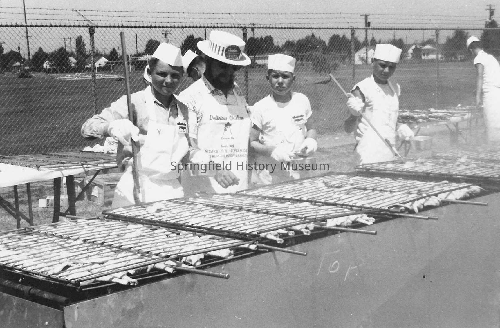 Photograph of an unknown man with beard and three unknown boys broiling chicken. This photo with a group from Broiler Festival in 1957.