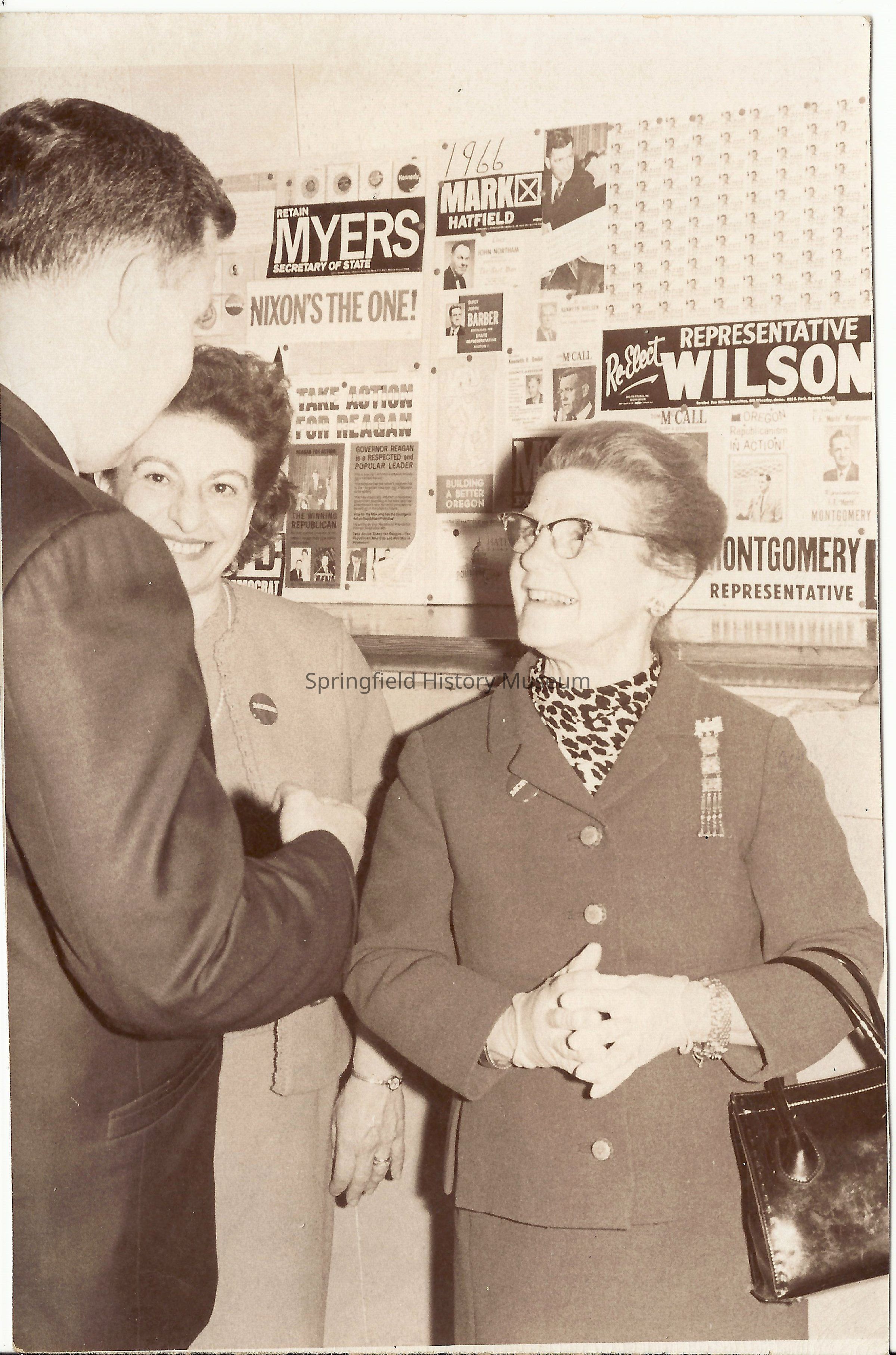Photograph of two unknown women talking to an unknown man with political posters behind them, maybe 1966