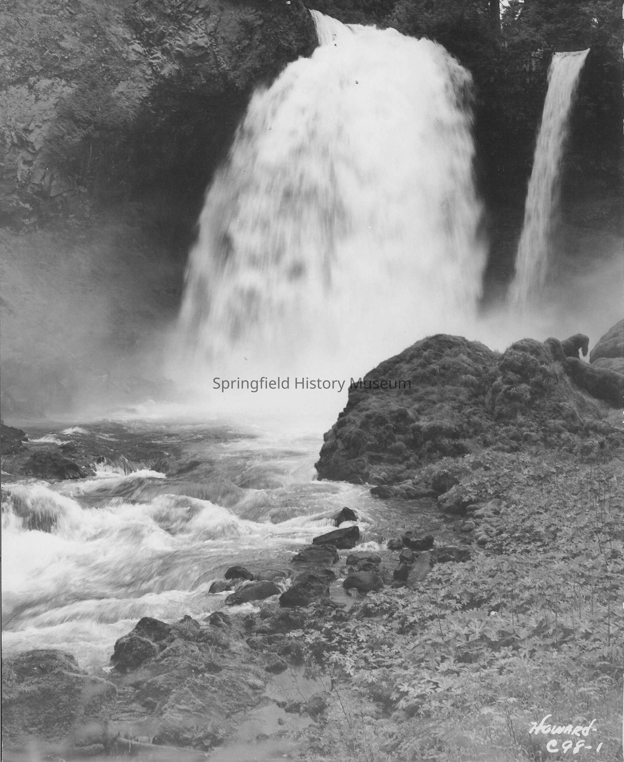 Falls of the Upper McKenzie River, 1947. Close-up of a big falls. Marked on front Howard C98-1