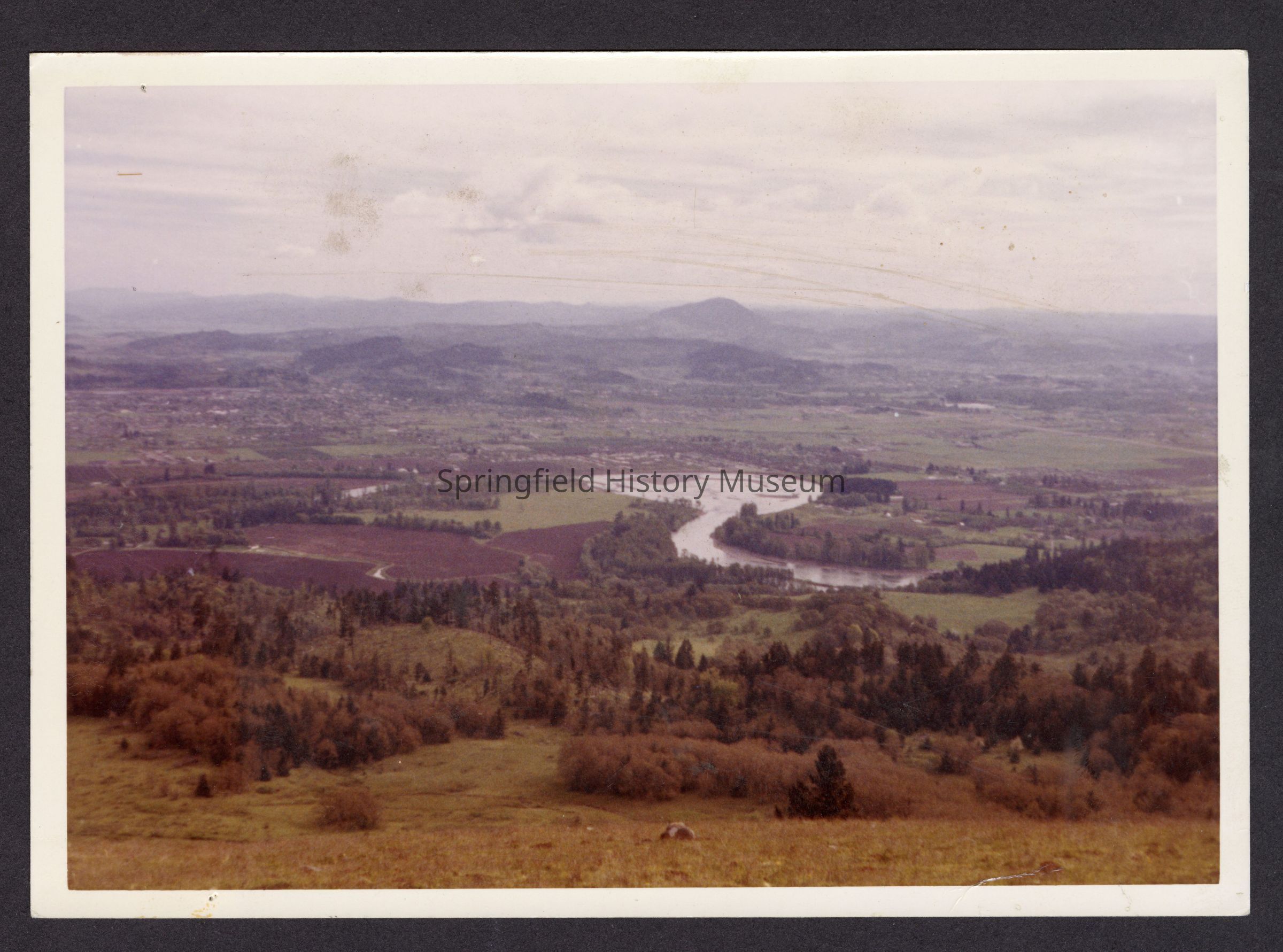 Color photo of view from Mount Baldy (Coburg Hills), looking south toward Springfield. Forms a rough panorama with images 2021.007.127 and 2021.007.129. McKenzie River in center. Printed on back, "This is a Kodacolor Print Made by Kodak May 1961 PAG."Collection