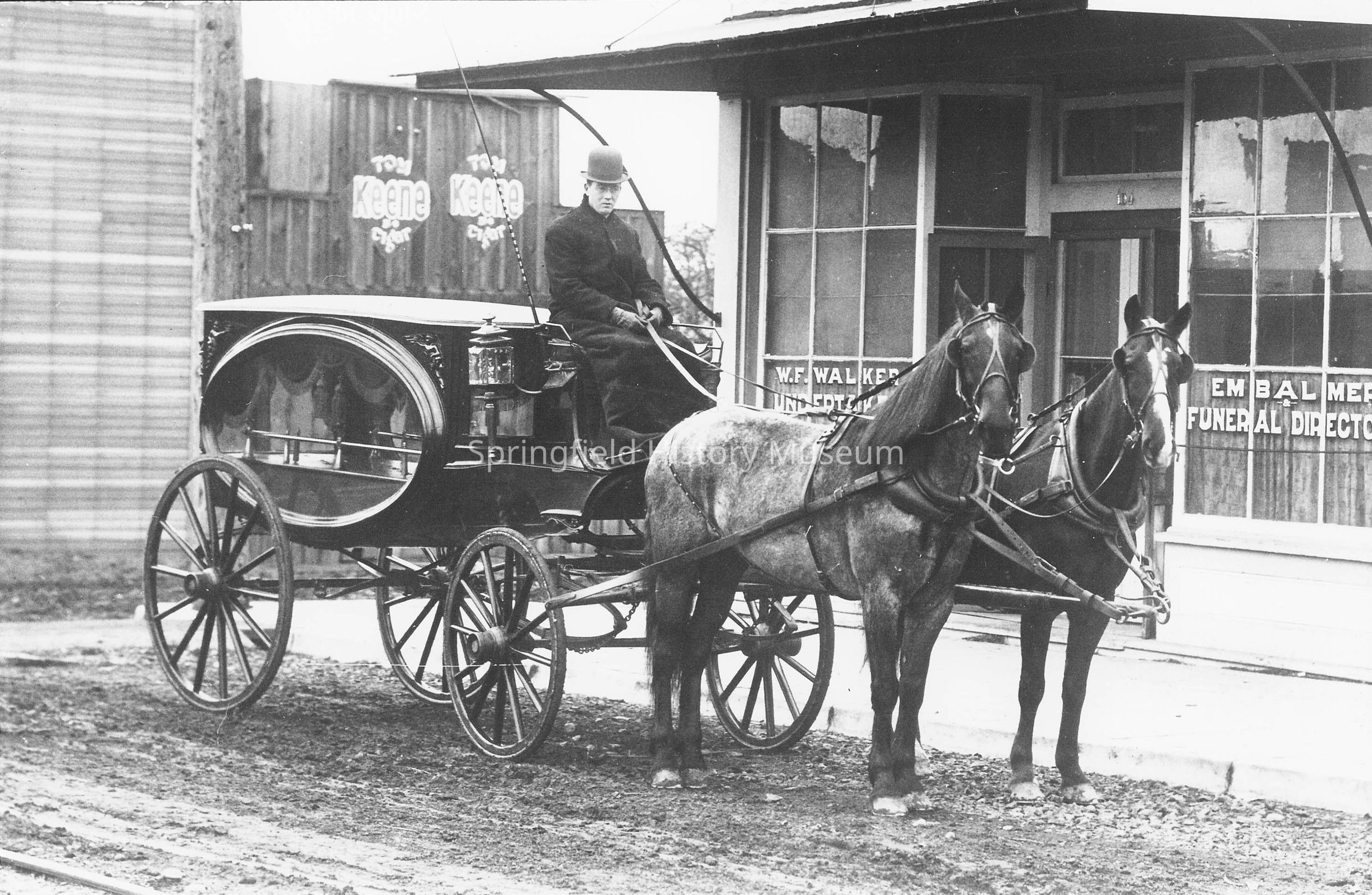 B&W Mounted photo of "Early day hearse standing in front of W.F. Walker Funeral Parlor at corner of Main and Mill St. Springfield, Oregon." Man drives team of horses on hearse with oval viewing window on side.Photograph Details