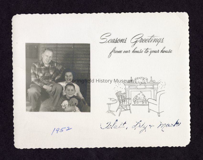 Seasons Greetings card with photo of Walt, Lily, and Mark Laxton, 1952.Collection