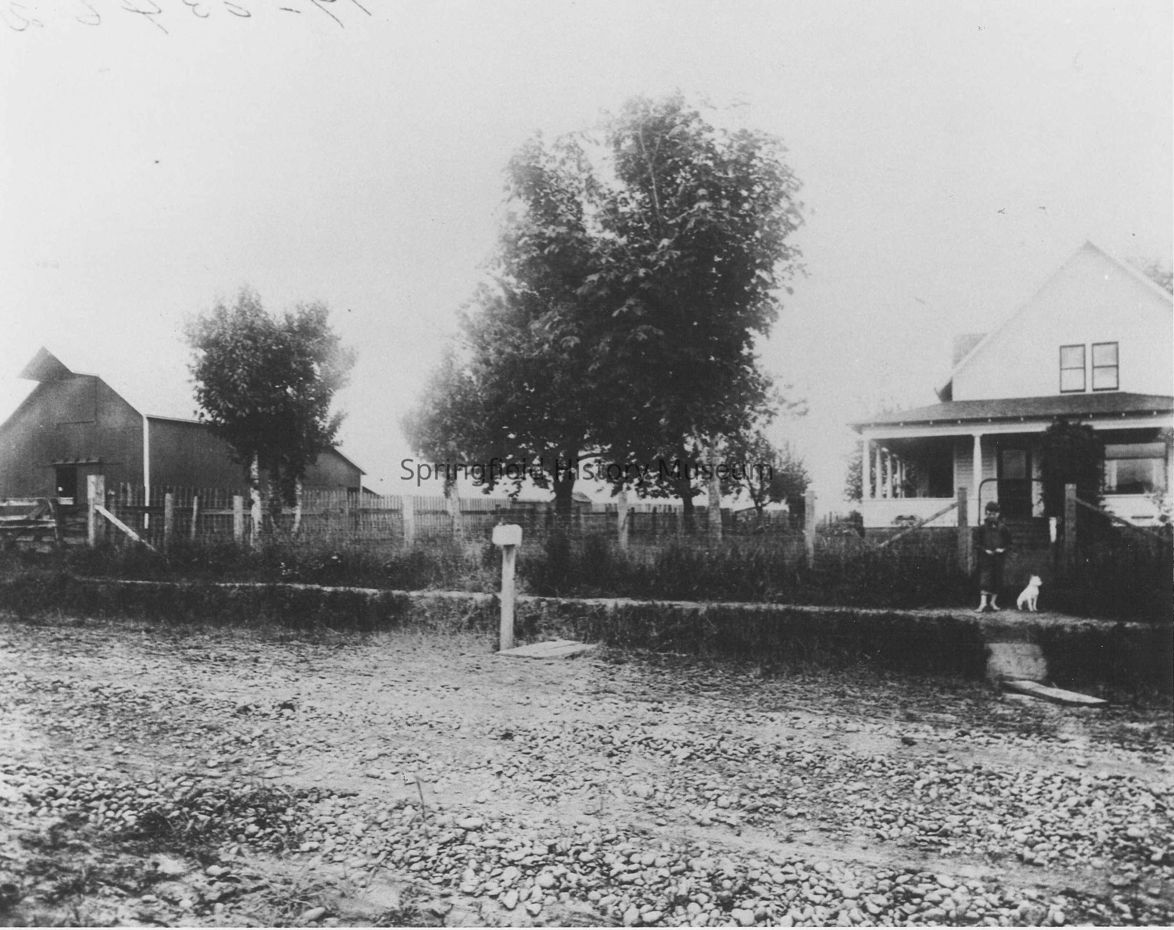 Walter W. and Melva E. McPherson house on North Mill street Creswell, Oregon. Virgil McPherson at front gate with dog. UndatedPhotograph Details