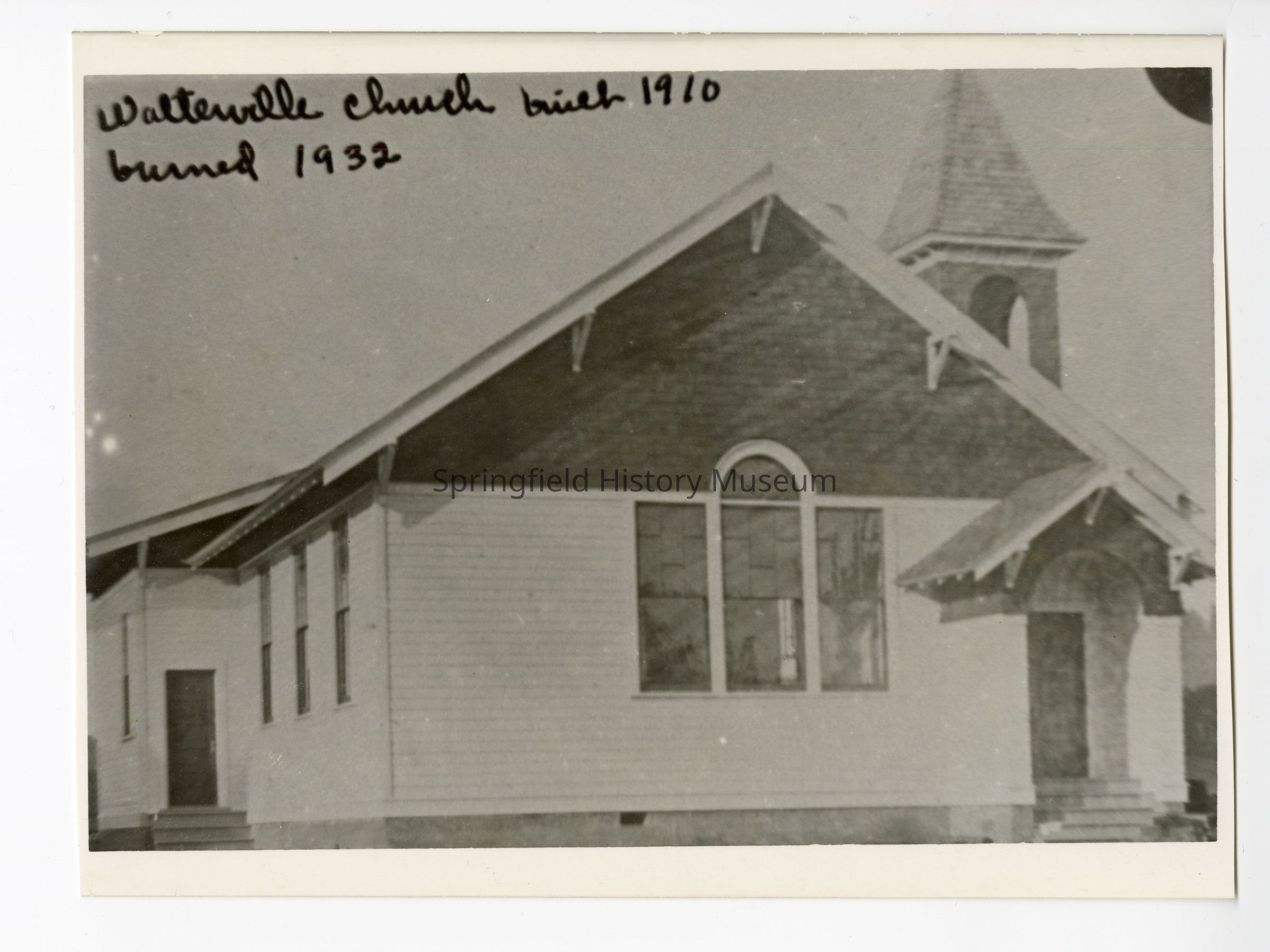 Photograph of Walterville Presbyterian Church Transcribed inscription on front: "Walterville Church built 1910, burned 1932"