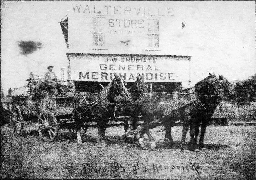 Business & Industry, Horses, J.W. Shumate, Walterville, Store, Market, Merchandise, B.T. Hendricks, B.F. Hendricks, Business & Industry--J.W. Shumate General Merchandise, Business & Industry--Walterville Store, Transportation--Animal--Horses, People--Groups & Individuals