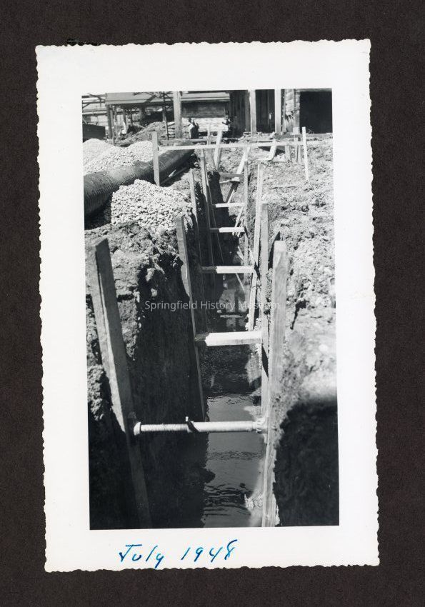 Photograph of water running through the path dug in the dirt at the Booth-Kelly Lumber Mill drainage construction site, Springfield, Oregon, 1948Entry/Object ID