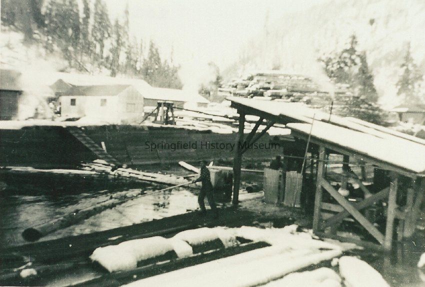 Westfir mill pond, foot bridge out , notice man pushing log in center of photo.