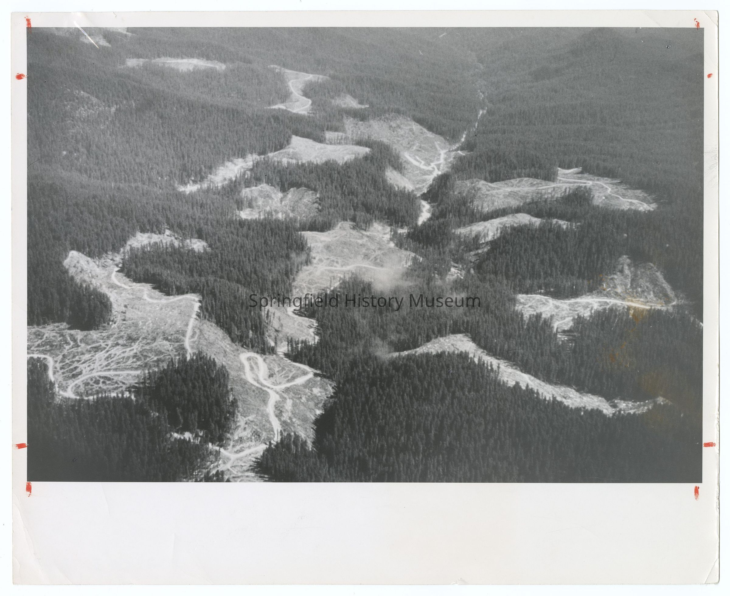 Inscription back: Weyerhaeuser (…), important, Record (..) W.T. Co. AA-374 To avoid delay in secuting duplicates use number above to identify this photograph. Lee Merril, Photographers 910 Commerce St - Main 4725, Tacoma 2 Washington; Inscription on note: " "Seed blocks of standing timber are left by loggers (foresters) to reseed logged areas under tree farming porgram designed to assure new stands of timber for future generations. Photo looks southwest from the head of Gales Creek down Little Fall Creek in Weyerhaeuser's Calapooya Tree Farm."Copyright