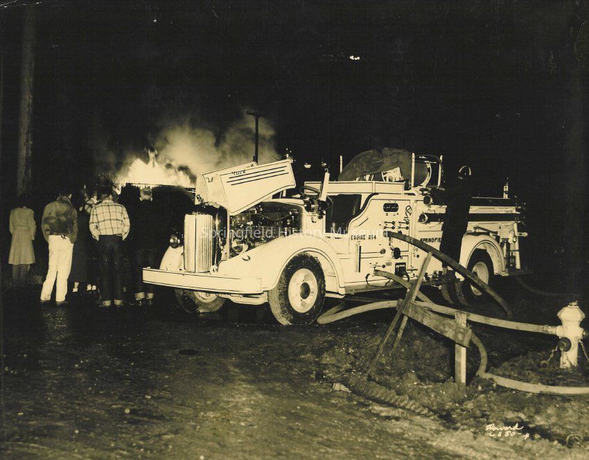 Photograph of white fire truck pumping from hydrant at night, Winlock Handle Factory fire, Springfield, Oregon, 1950.Entry/Object ID