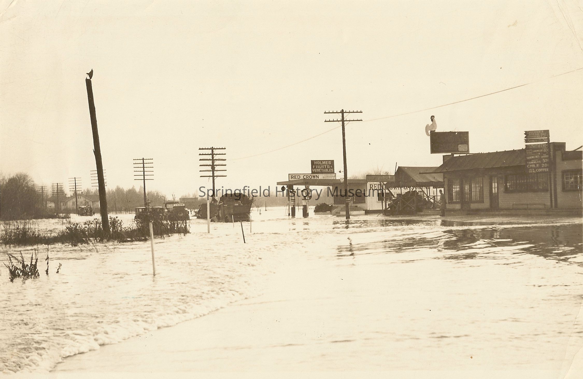 Black and white photo of the Willamette river flooding in west Springfield, dated 1929. Two businesses are in the foreground. Closer building is possibly a store as it has a tall pole of signs with products and costs. There is a man standing in front of building watching rising waters. Second building is "Red Crown Gasoline" with a sign above it that reads "Holme's Fruit and Vegetables". In the center is a truck attempting to drive through the rising waters. There are at least four more cars in the picture. Stamped on reverse "Percy C. Rollins, 10617 NE 11th Avenue, Vancouver, Wahington 98665"