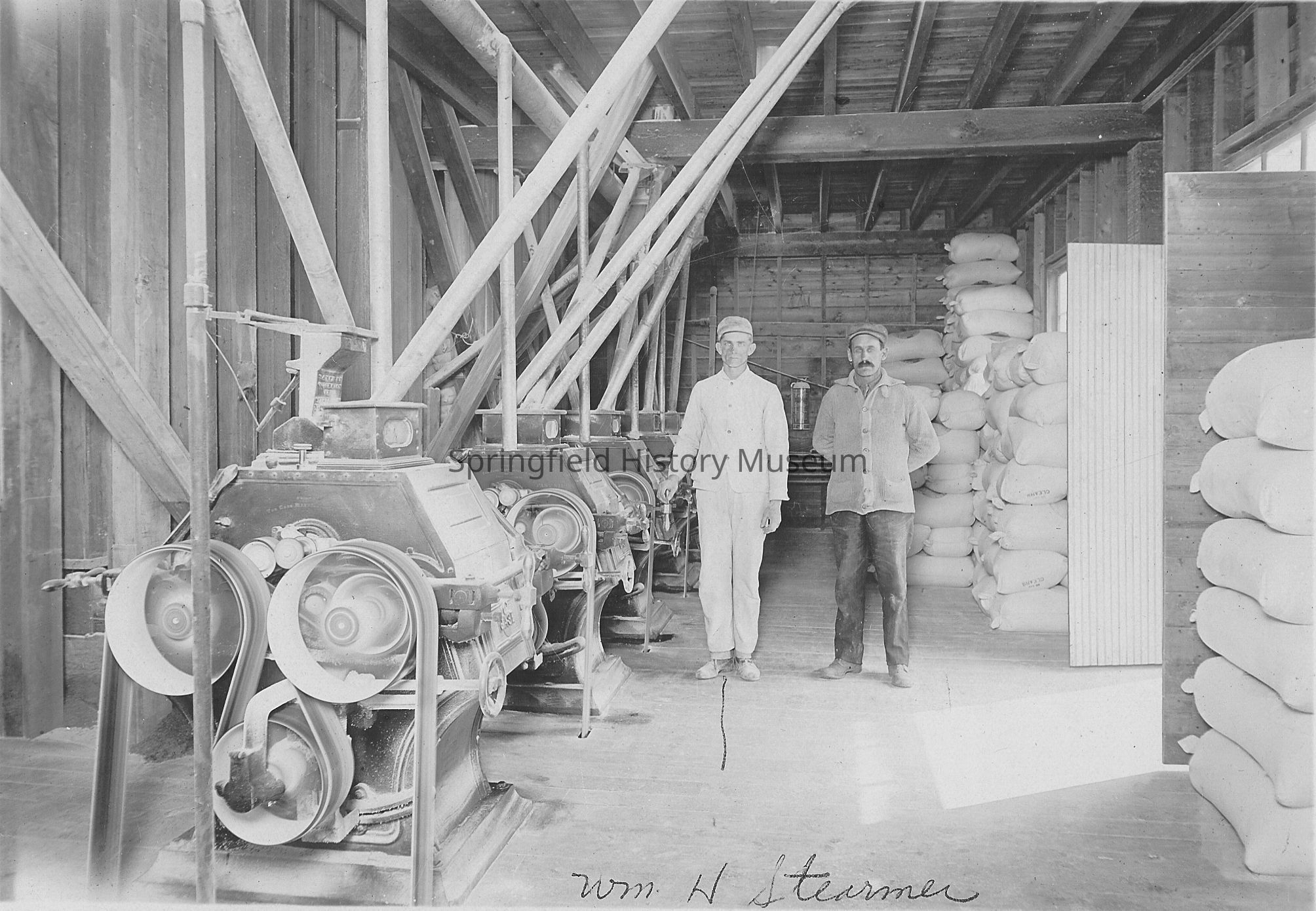 Two men standing inside the Springfield Flour Mill. One of the men identified as William H. Stearmer, no date, mounted on dark board.