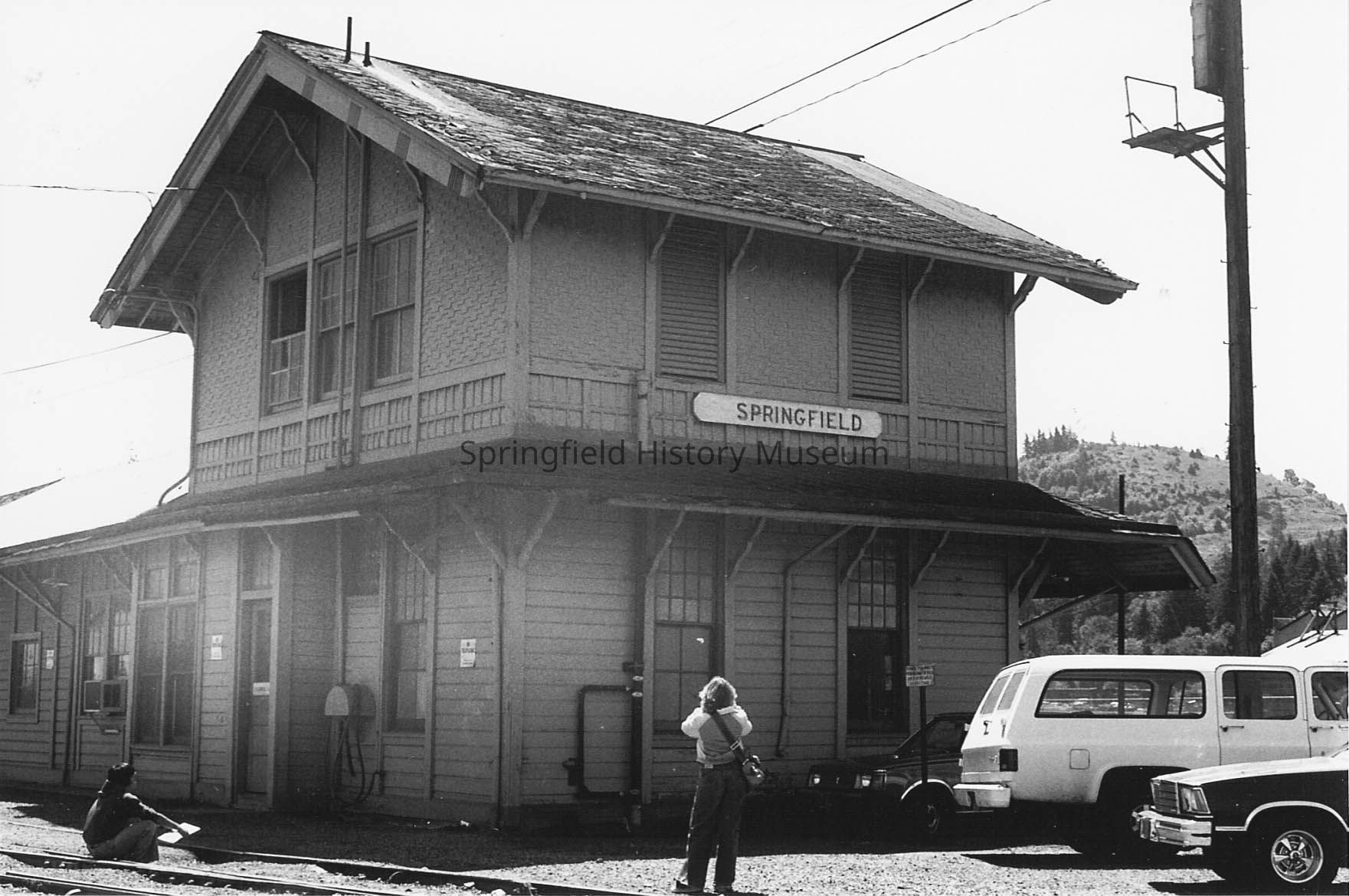 The Springfield Depot, undated. One woman taking photos of the sign on the side of depot.