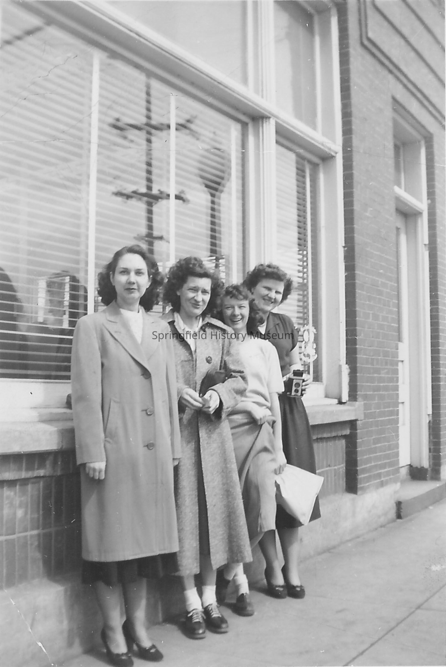 Four women standing outside the Mountain States Power Company at Sixth and Main in Springfield; 1949. Women are identified as; Louise Peterson, cashier; Helen Bennett, who wrote orders; Colleen Paulson (later Froemming), bookkeeper; and Erma Froemming (later Buckner), who wrote orders.