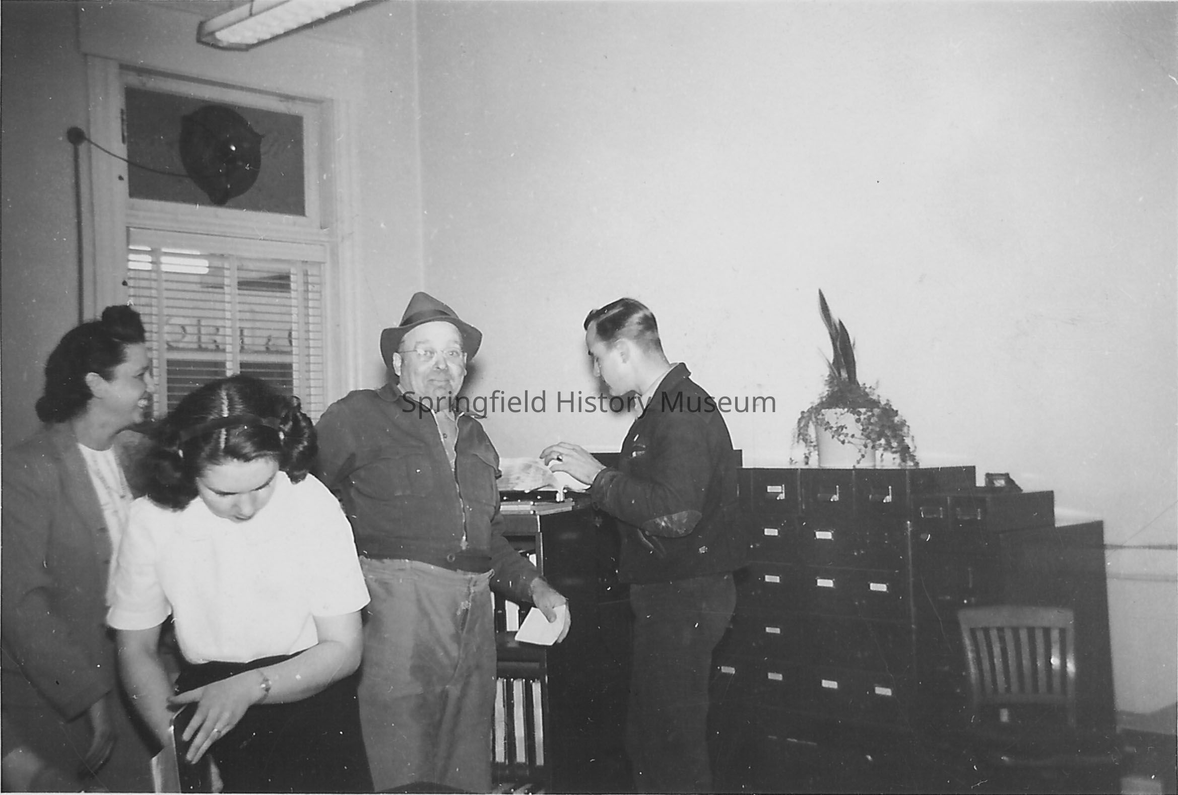 Four people inside the office of Mountain States Power Company at Sixth and Main in Springfield; 1949. People are identified as; Bertha Schackmann, office manager; Louise Peterson, cashier; Cliff Chamberlain, meter-reader; and Lloyd Allbriton, hook-up services.