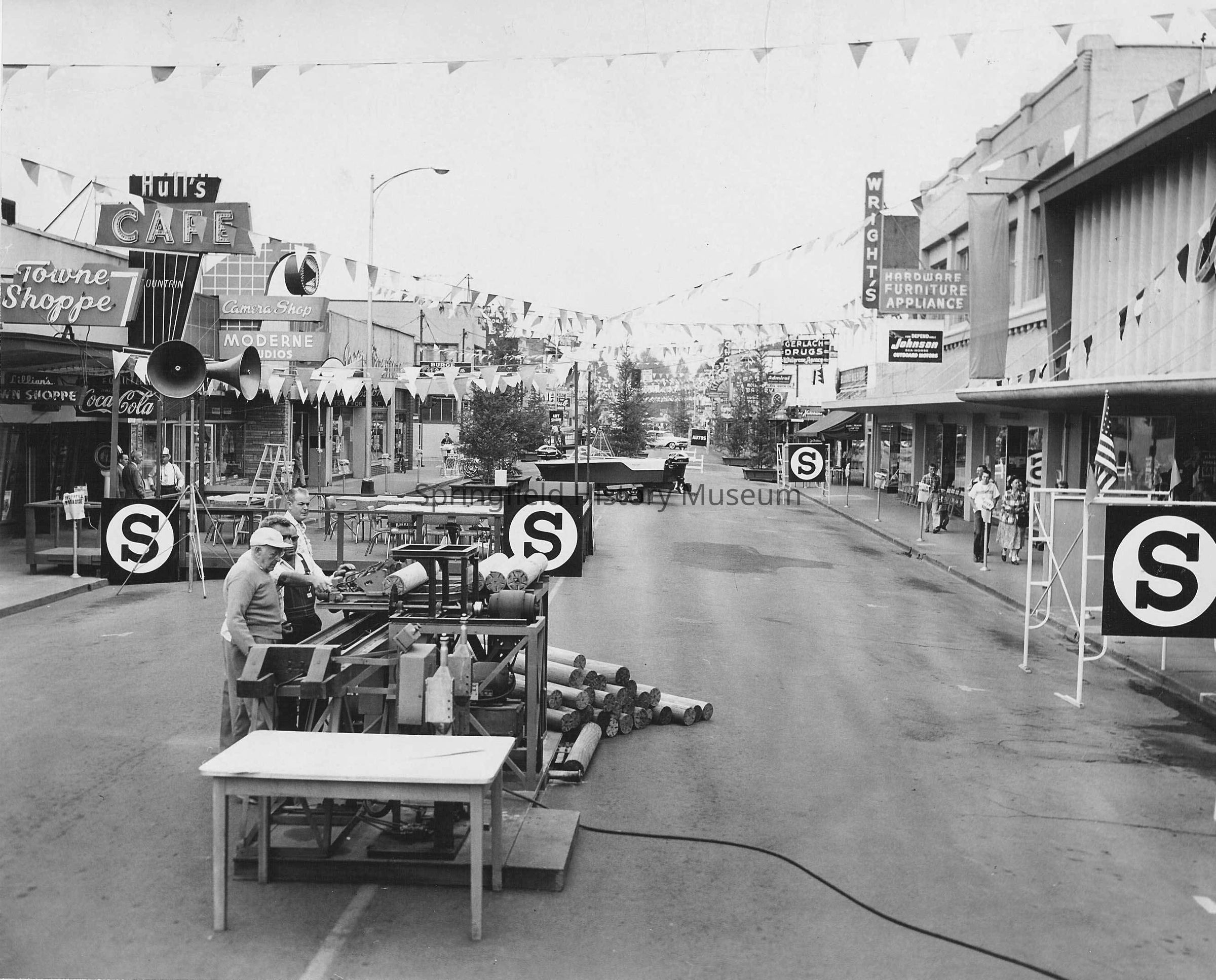 Business & Industry, Street Views, Shoppers Paradise, Gerlach's Drugstore, Hull's Cafe, Main Street, 4th Street, 6th Street, Moderne Studio, Towne Shoppe, Wright's Hardware, Woodworking, Display, Business & Industry--Shoppers Paradise, Business & Industry--Gerlach's Drugstore, Business & Industry--Restaurants & Cafes--Hull's Cafe, Springfield--Streets--Main Street, Springfield--Streets--4th Street, Springfield--Streets--6th Street, Business & Industry--Moderne Studio, Business & Industry--Towne Shoppe, Business & Industry--Wright's Hardware, People--Groups & Individuals