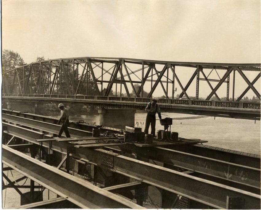 Transportation, Construction, Springfield Bridges, Girders, Willamette River, South Bridge, Transportation--Roads & Bridges, Construction--Roads & Bridges, Construction--Personnel, Waterways--Willamette River, People--Groups & Individuals