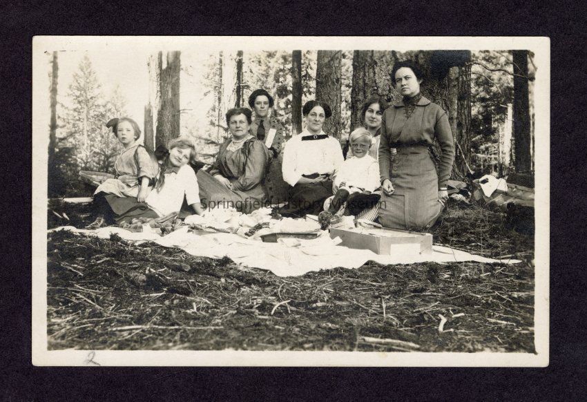 Transcribed inscription on reverse: "This is the women folk in our bunch, just as we had the dinner spread I tell you there was some grub on that cloth. There was eighteen eat from hear and plenty left for a half [doz?] more."Lexicon