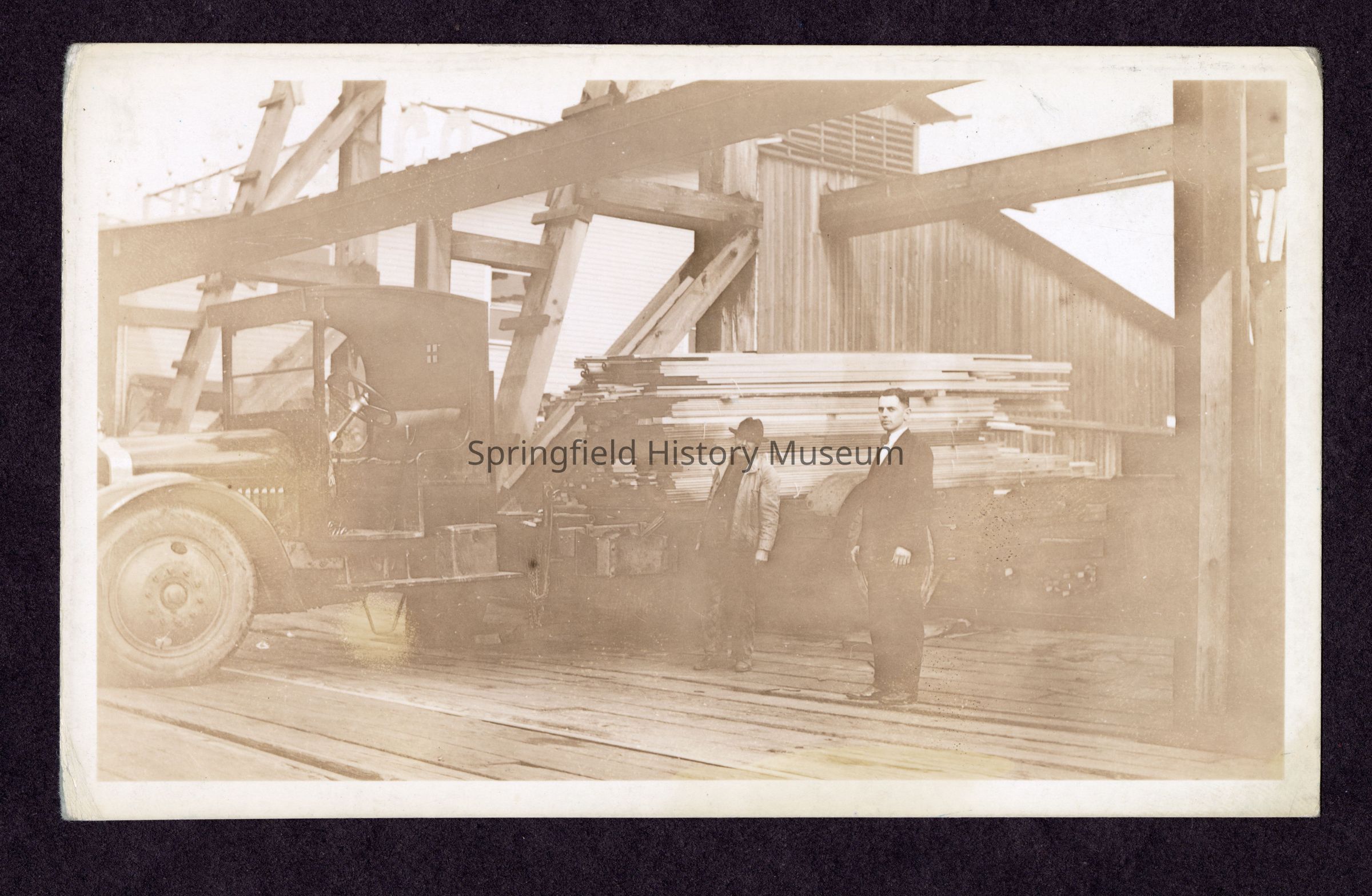 Photograph on postcard of loaded lumber truck at Jones Lumber Company. Two men in photograph. One on left is Arthur Crosby, other us unknown. Faded Jones Lumber Company Stamp on back right. Date unknown.