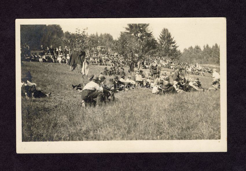 Photograph on postcard of people sitting, talking and looking at something at the lodge picnic at Camp Creek SchoolEntry/Object ID