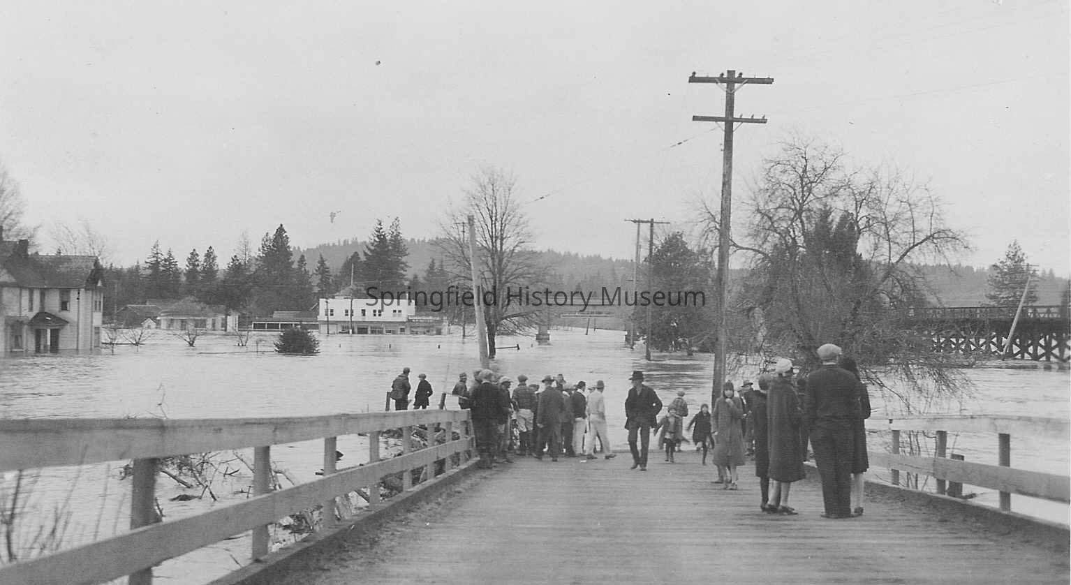 Photograph on postcard of people watching a flood on ramp of wooden bridge from Springfield to Glenwood. On the far side of the flooded river you can see the Springfield Arch. This must be the bridge that washed out.