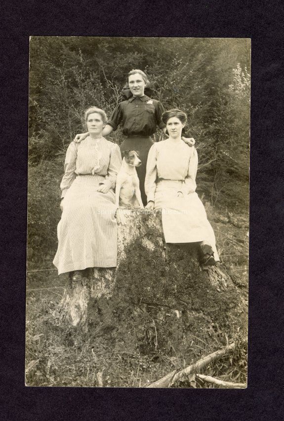 Photograph on postcard of 3 women (Aunt Emma, Clara and Maud) and a dog on a tree stump, undated, unknown location