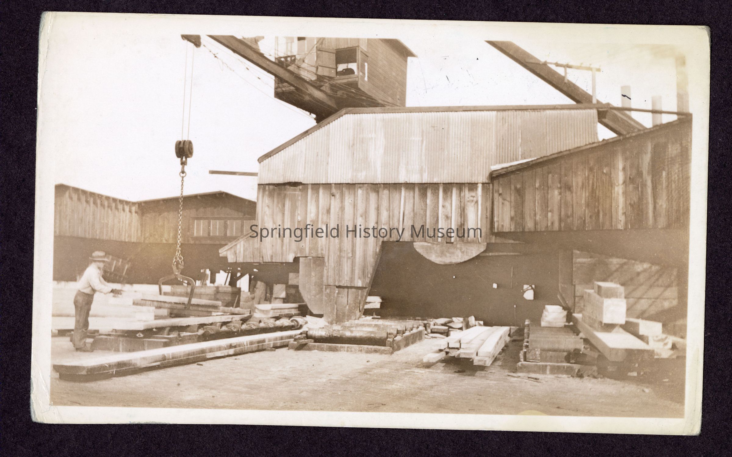 Transcribed inscription on reverse: "Timber, flitch and cant dump. Graded and Trimmed to proper length. Main rolls from headsaw and edger."