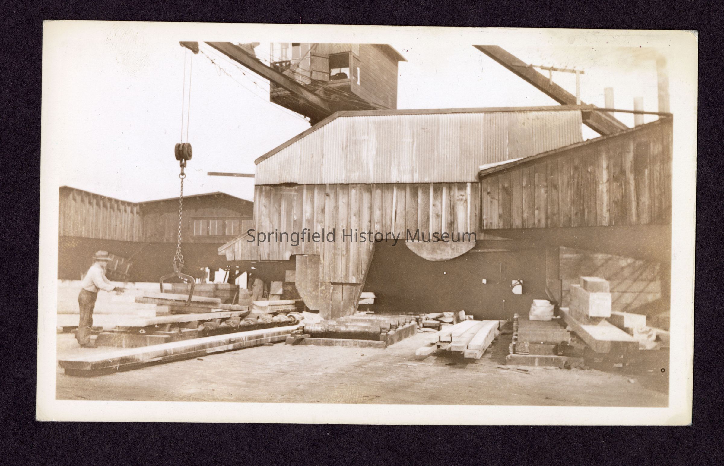 Transcribed inscription on reverse: "Timber, flitch and cant dump. Graded and Trimmed to proper length. Main rolls from headsaw and edger."
