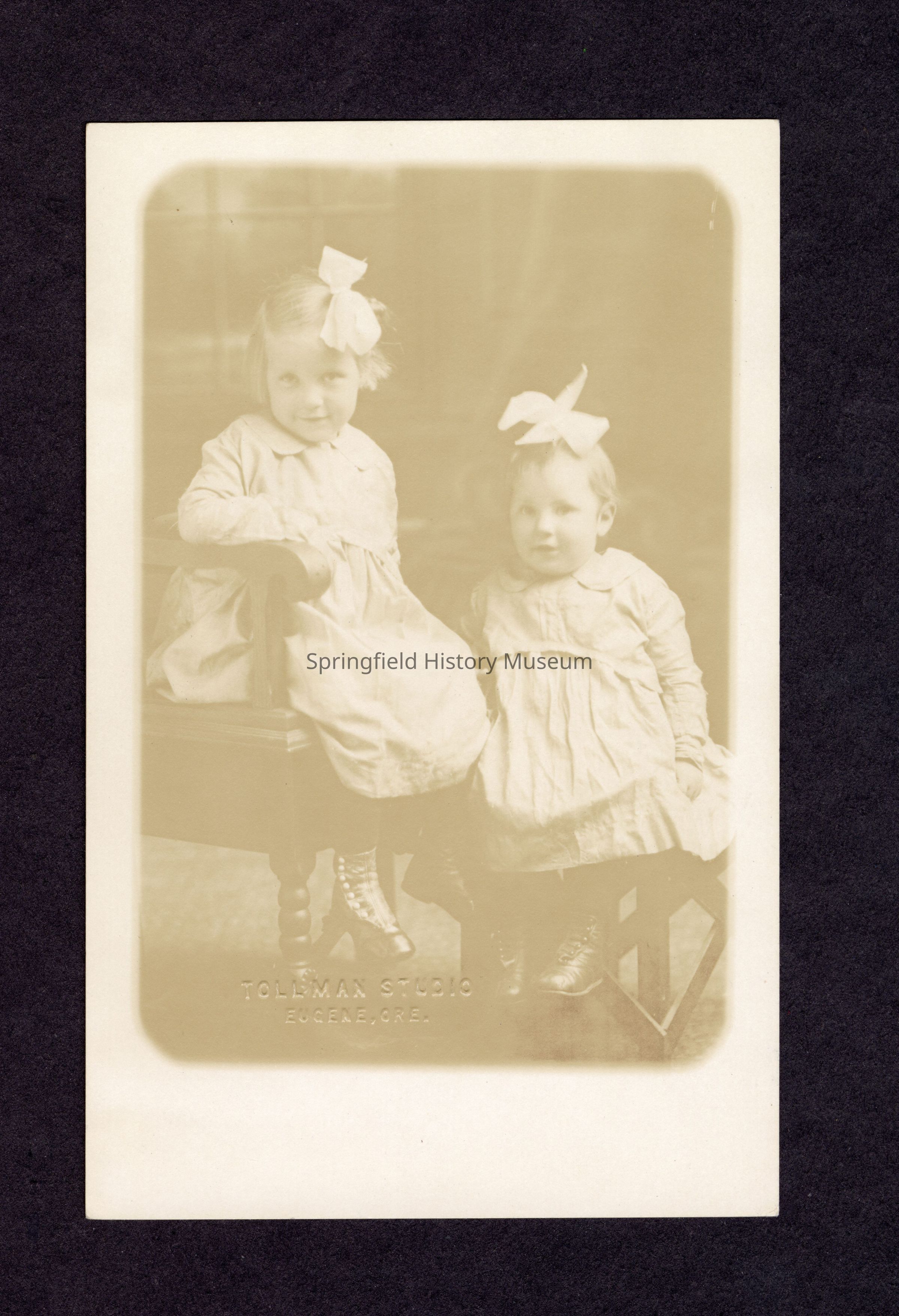 Photograph on postcard of two girls by Tollman Studio, Eugene Oregon, on back: "Grace and Helen"