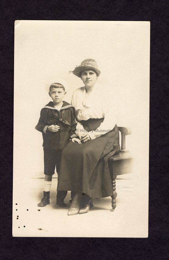 Photograph on postcard of women in chair and boy standing next to her, undated Transcribed inscription on reverse: "Lillie and Jamie"