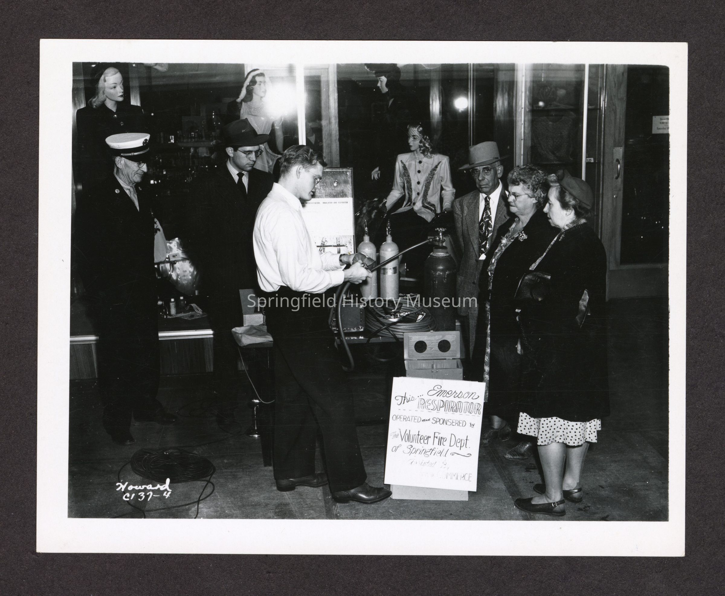 Black and white photograph of two women and four men standing in front of a storefront at the volunteer fire department's respirator demonstration. The sign in the middle reads, "The Emerson Respirator, Operated and Sponsored by the Volunteer Fire Department of Springfield - Assisted by [Chamber of] Commerce." Front left corner marked "Howard C137-4." Undated.Collection