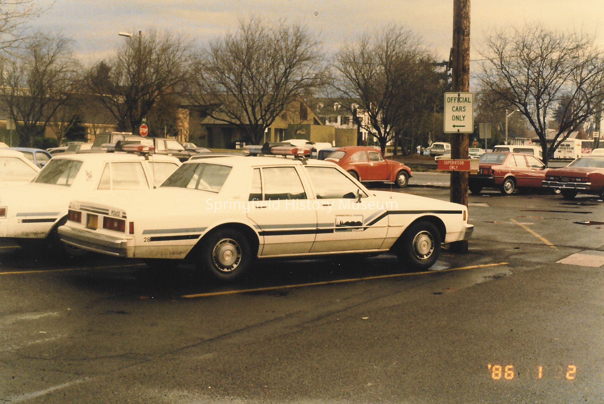 City of Springfield police car parked in an Official Cars Only parking lot, dated 2 January 1986.Collection