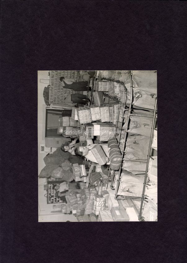 B&W Photo of back room of the Post Office at 4th and Main St. Springfield, Oregon during the Christmas rush of 1948.Photograph Details