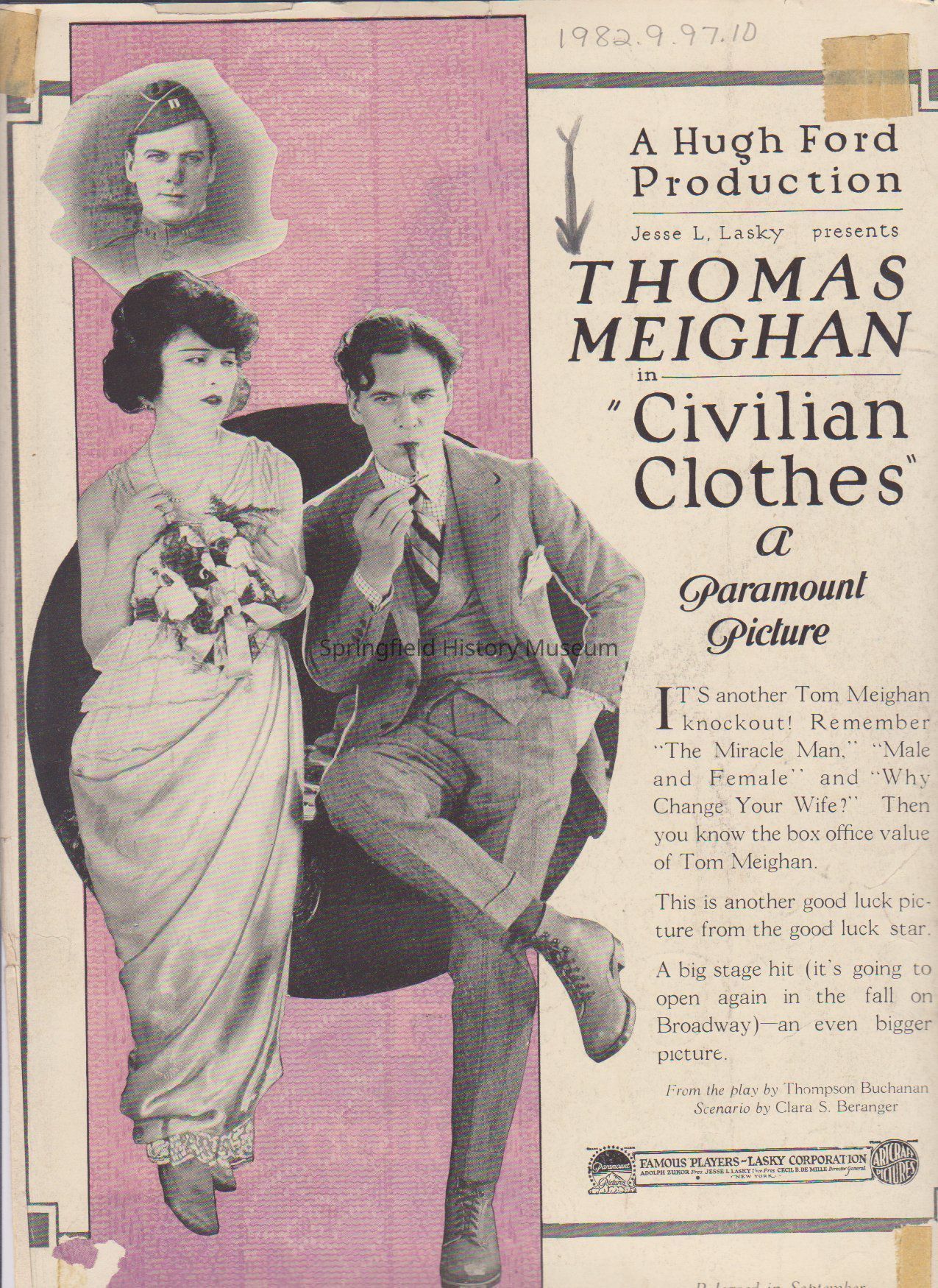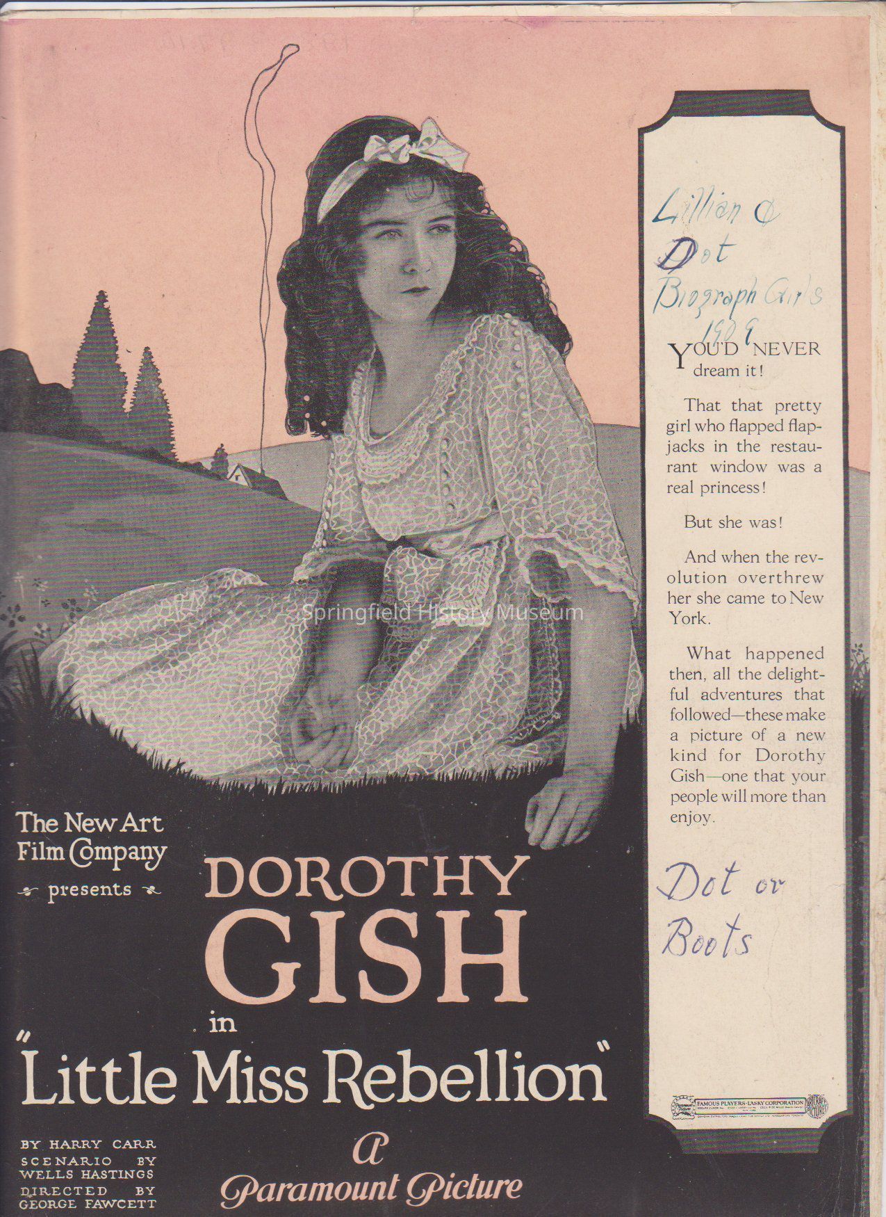 1) Photo / Advertisement for The Newart Film Company Presents Dorothy Gish in "Little Miss Rebellion" A Paramount Picture. Back: A Hugh Ford Production. Jesse L. Lasky presents Thomas Meighan in "Civilian Clothes". A Paramount Picture.