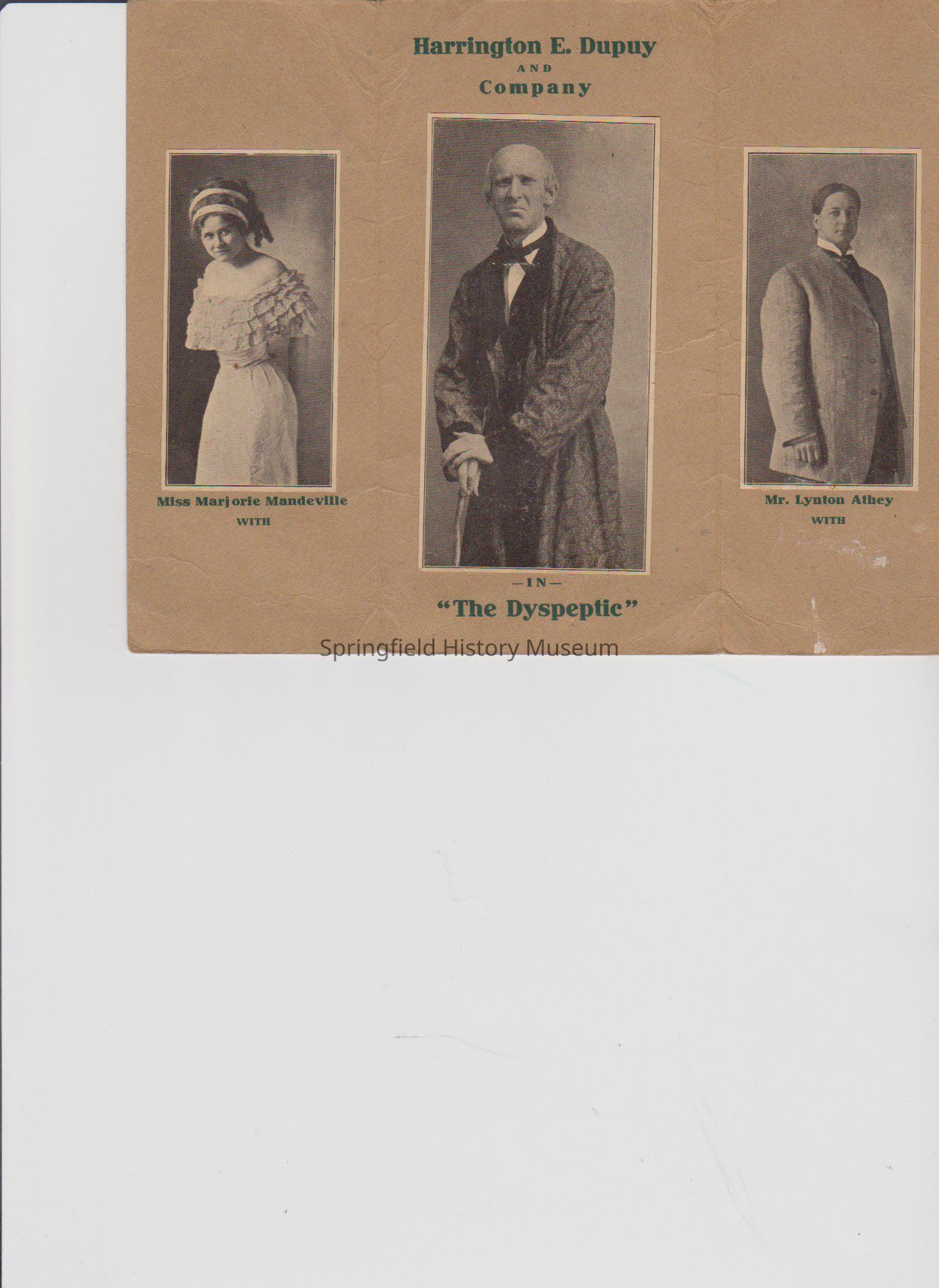 Picture/ Advertisement for Harrington E. Dupuy and company in "The Dyspeptic", with Miss Marjorie Mandeville, and Mr. Lynton Athey.