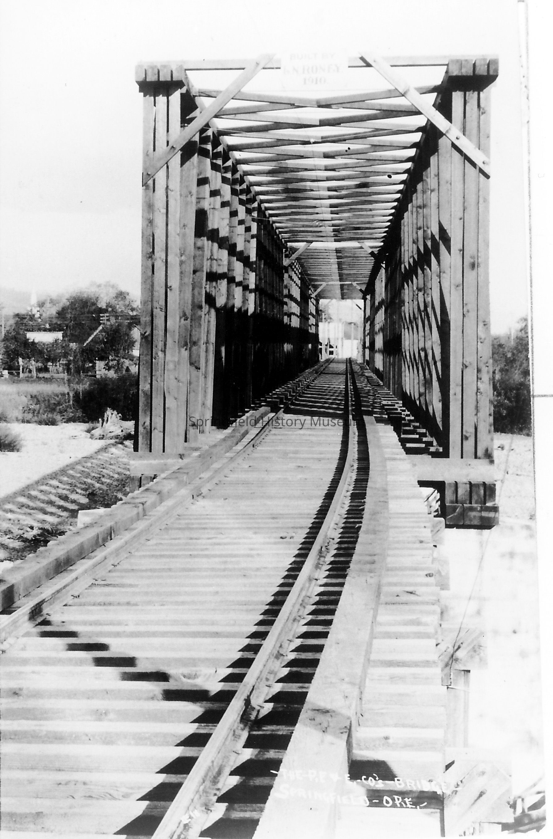 The Portland, Eugene and Eastern counties railroad bridge at Springfield, circa 1911. Bridge built by L. N. Roney in 1910.