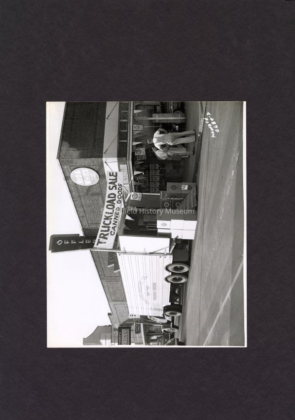 B&W Photo of Red & White food stores. Banner says "Truckload Sale Canned Goods."Collection