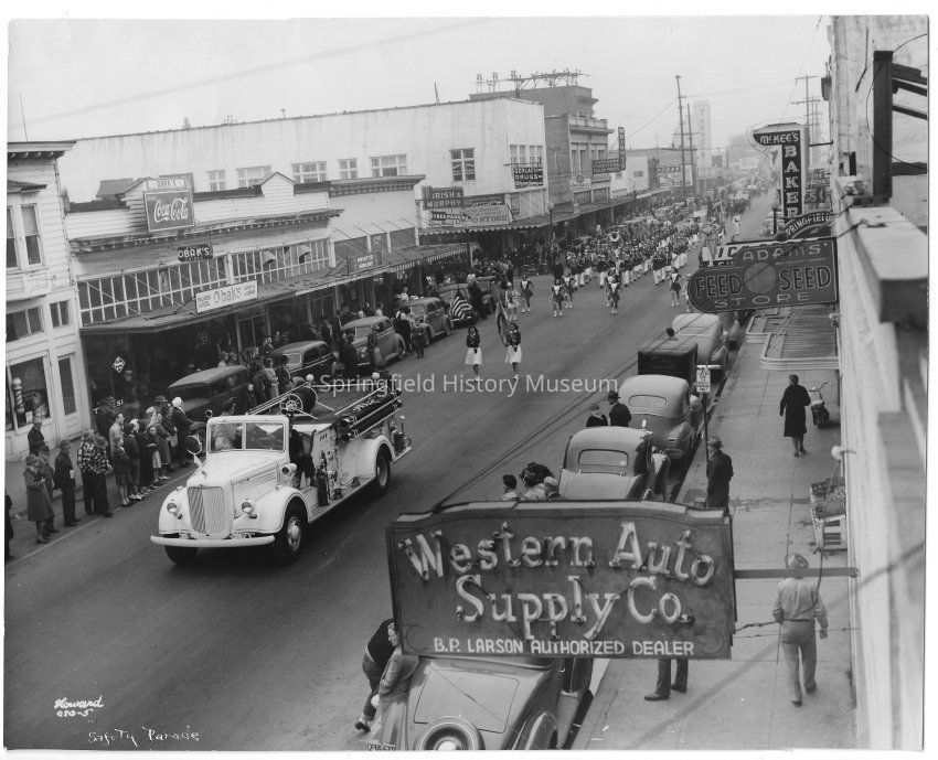 Photograph of Safety Parade in downtown Springfield. Fire Department truck leads heading west down Main Street, with two girls walking with flags directly behind, and a large marching band behind them. McKenzie Theater is visible in upper right corner of the photo, dating this image to sometime after 1946. Other businesses visible include: the Pacific Power and Light headquarters (currently the home of the Springfield Museum), Western Auto Supply, Obak's, Pruitt's General Paints, Irish & Murphy, Gerlach Drug, Wright's Hardware, McKee's Bakery, an ice cream shop, and Adams' Feed & Seed Store. Photo is original, with "Safety Parade" added in white ink to the lower left corner. In good condition.Acquisition