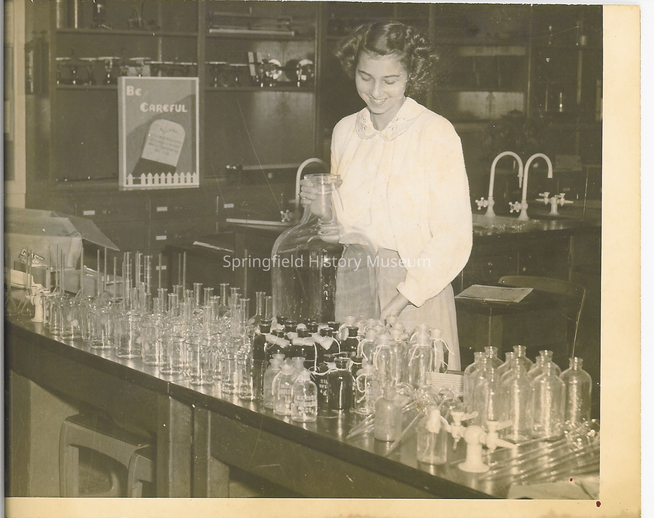 An unidentified female student, in science lab at Springfield High with several glass beakers.
