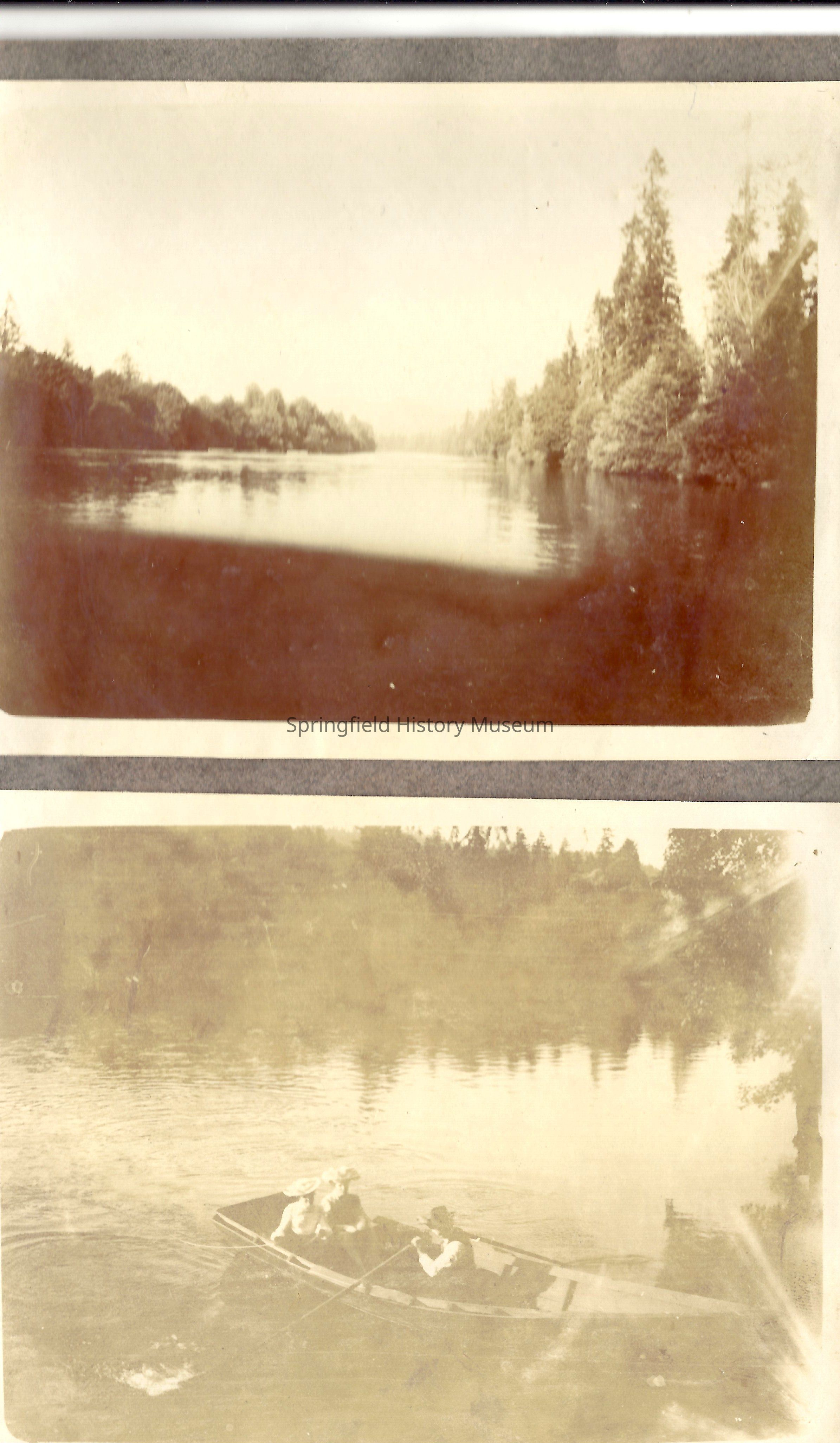 Seavey's Ferry and scenes around the ferry. One photo shows people on the ferry, 2 photos are scenic and last photo shows people in a row boat. All four are glued onto a grey 9 1/4 x 7 album page.